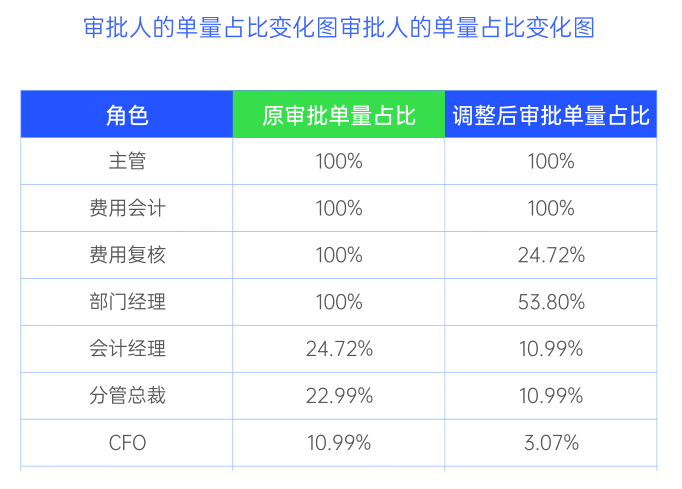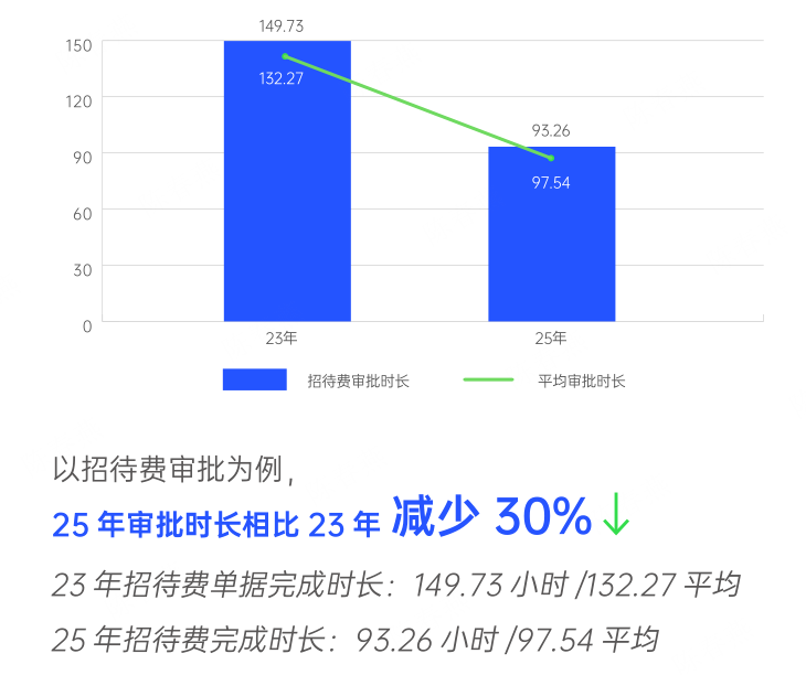 同時,系統(tǒng)通過智能審批規(guī)則重構(gòu),大幅提升效率:低風(fēng)險(xiǎn)事項(xiàng)由系統(tǒng)自動校驗(yàn)通過,“費(fèi)用復(fù)核”“部門經(jīng)理” 等角色的審批單量占比分別從 100% 降至 24.72%、53.80%,CFO 審批占比從 10.99% 降至 3.07%。數(shù)據(jù)顯示,25 年招待費(fèi)(含差旅)審批時長較 23 年減少 30%,僅需 93.26 小時,且差旅成本與直播場次的關(guān)聯(lián)分析通過 BI 看板實(shí)時呈現(xiàn),為 “哪些明星場次差旅投入性價比更高” 提供決策依據(jù)。