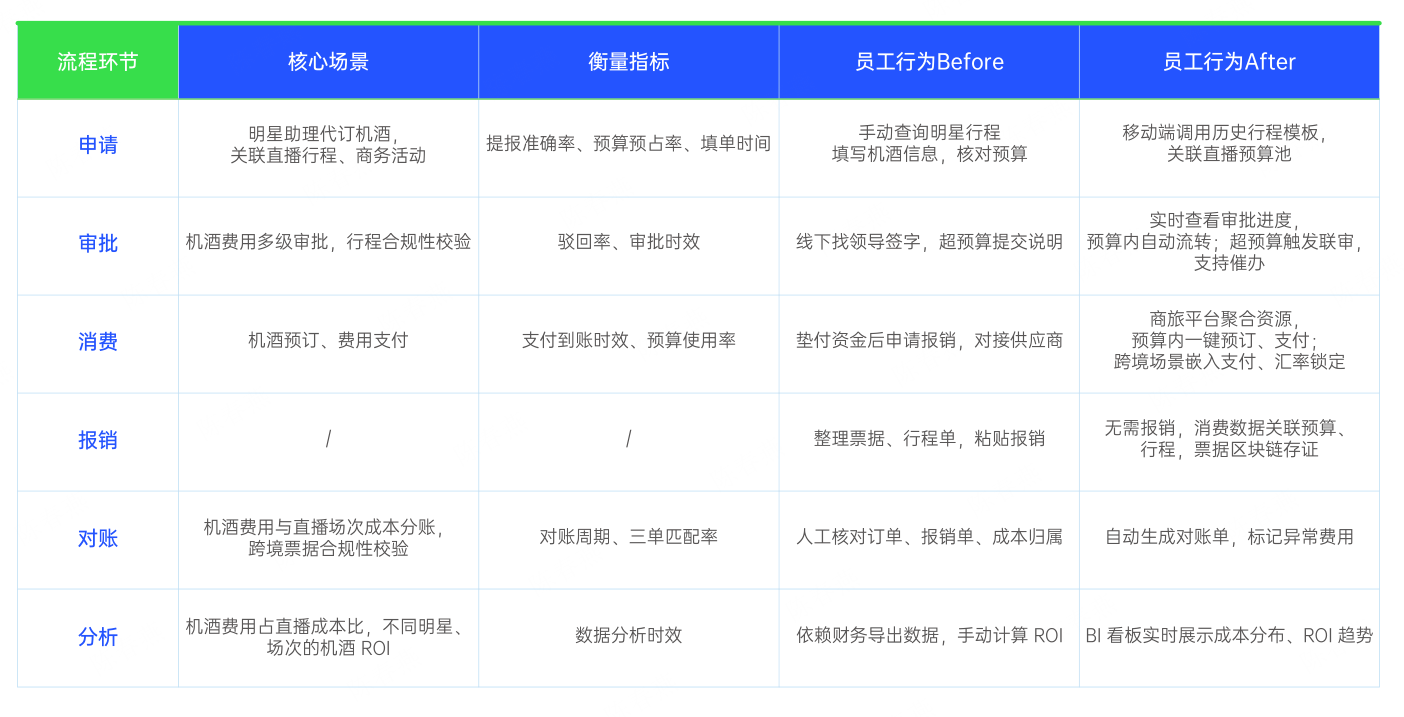 差異化差旅管理,對頭部藝人采用 “助理代訂 + 預(yù)算動態(tài)管控” 模式,整合高端差旅資源,將機(jī)酒預(yù)訂、行程管理納入系統(tǒng)閉環(huán),差旅成本關(guān)聯(lián)單次直播總成本;對普通員工實(shí)施剛性規(guī)則約束,確?;A(chǔ)管控。