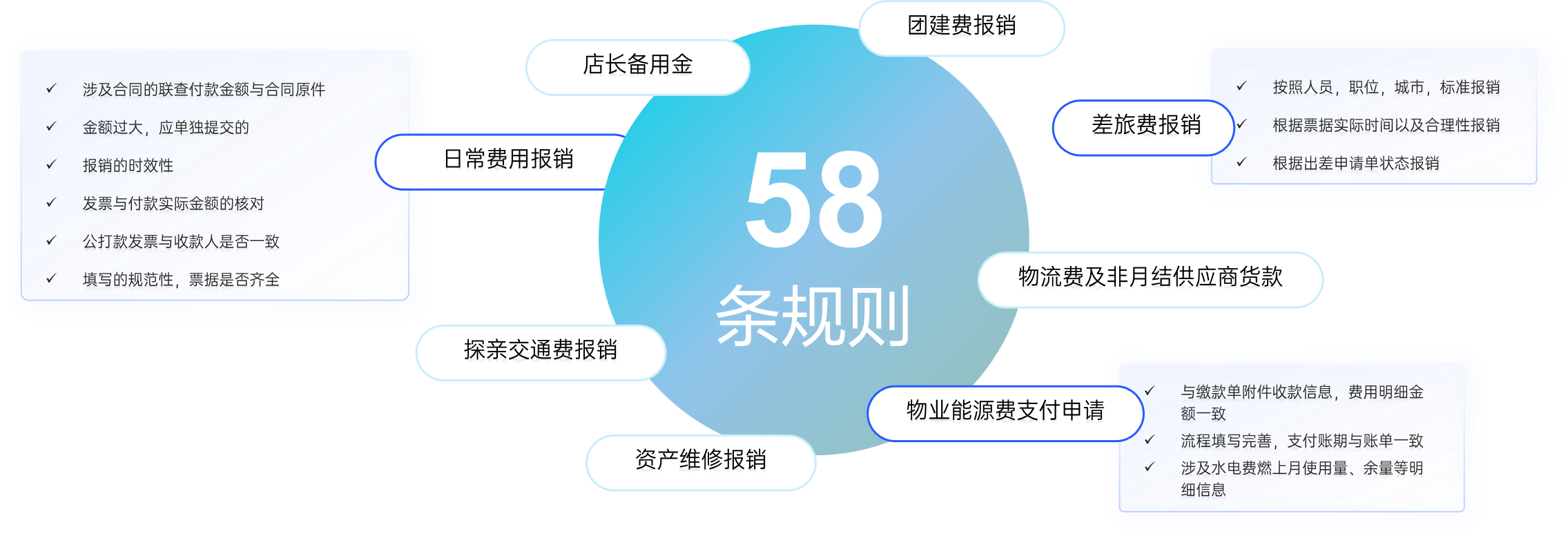 餐飲行業(yè)費用場景零散且特殊,云海肴每筆費用需覆蓋 “公打款發(fā)票與收款人一致性”等 20 余個審核點。依賴人工記憶財務(wù)制度,易出現(xiàn) “差旅費超標(biāo)準(zhǔn)未察覺”等疏漏,不僅增加合規(guī)風(fēng)險,還導(dǎo)致員工反復(fù)返工,影響業(yè)務(wù)推進效率。