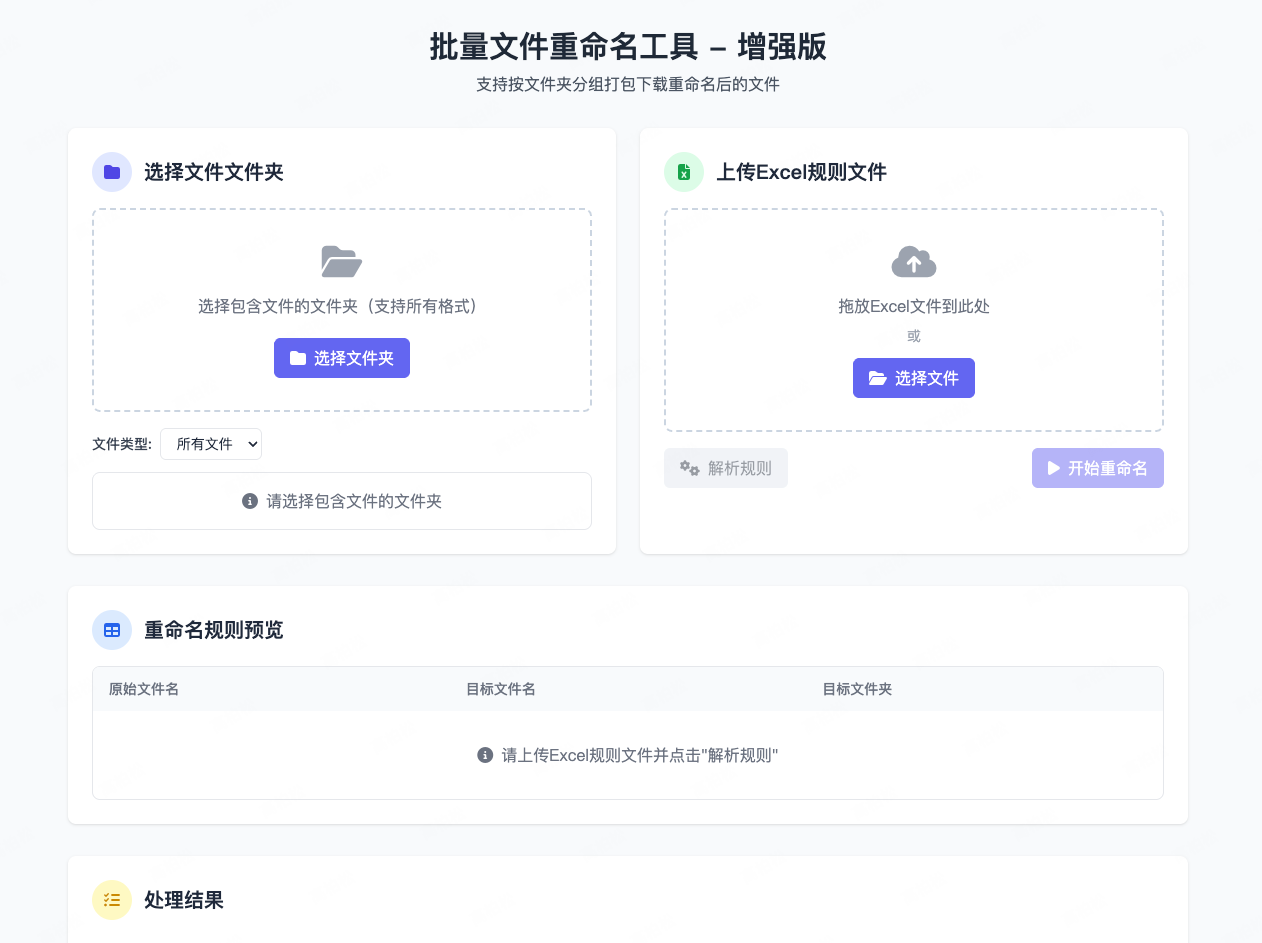 上傳配置好的 Excel 文件,預(yù)覽改名效果無誤后點擊 “開始處理”