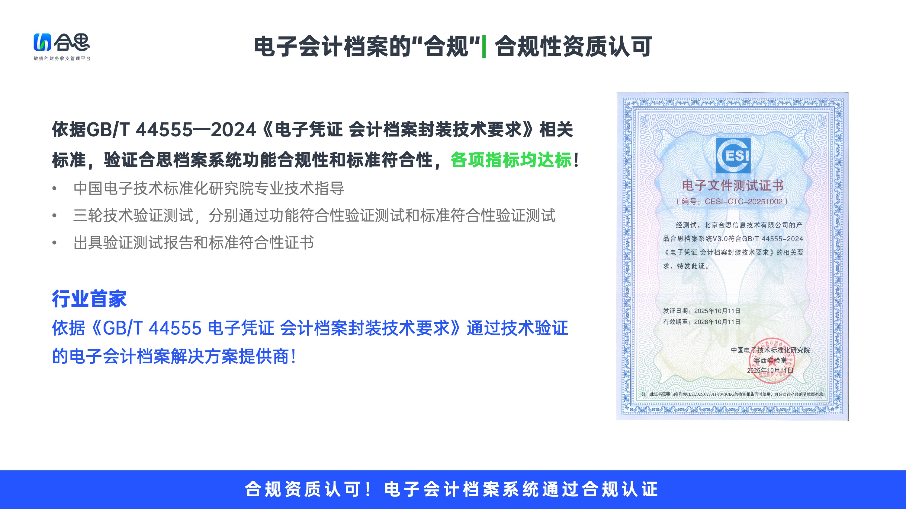 當行業(yè)仍在探索合規(guī)落地路徑時,合思檔案已率先通過了《GB/T 44555 電子憑證 會計檔案封裝技術要求》國家標準符合性認證,成為中國電子技術標準化研究院(CESI)認證的行業(yè)首家解決方案提供商,為企業(yè)電子會計檔案管理搭建起 “電子憑證全鏈路合規(guī)屏障”。